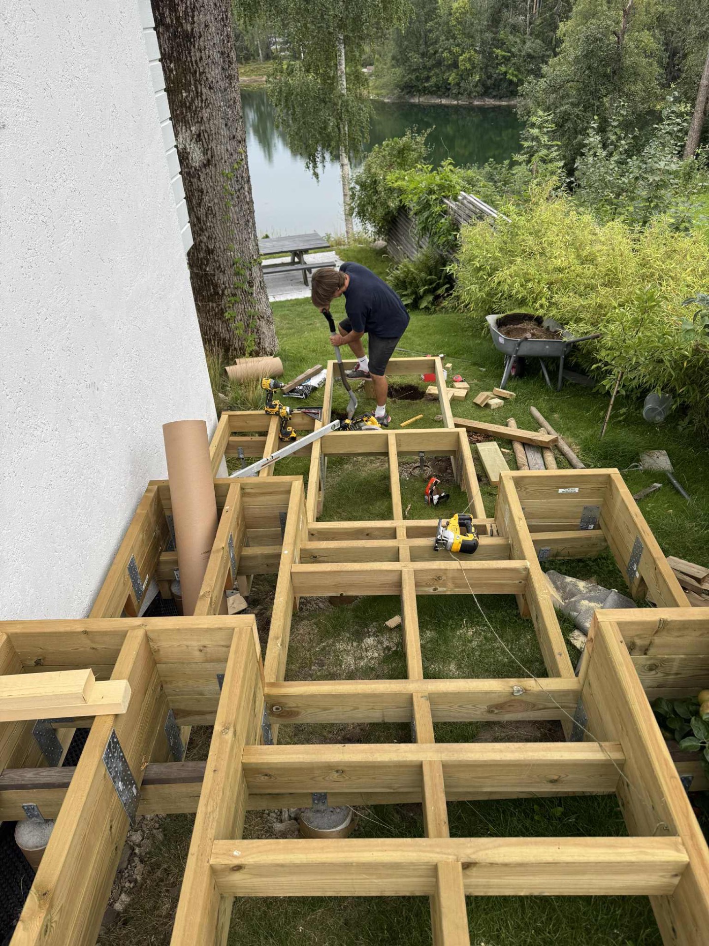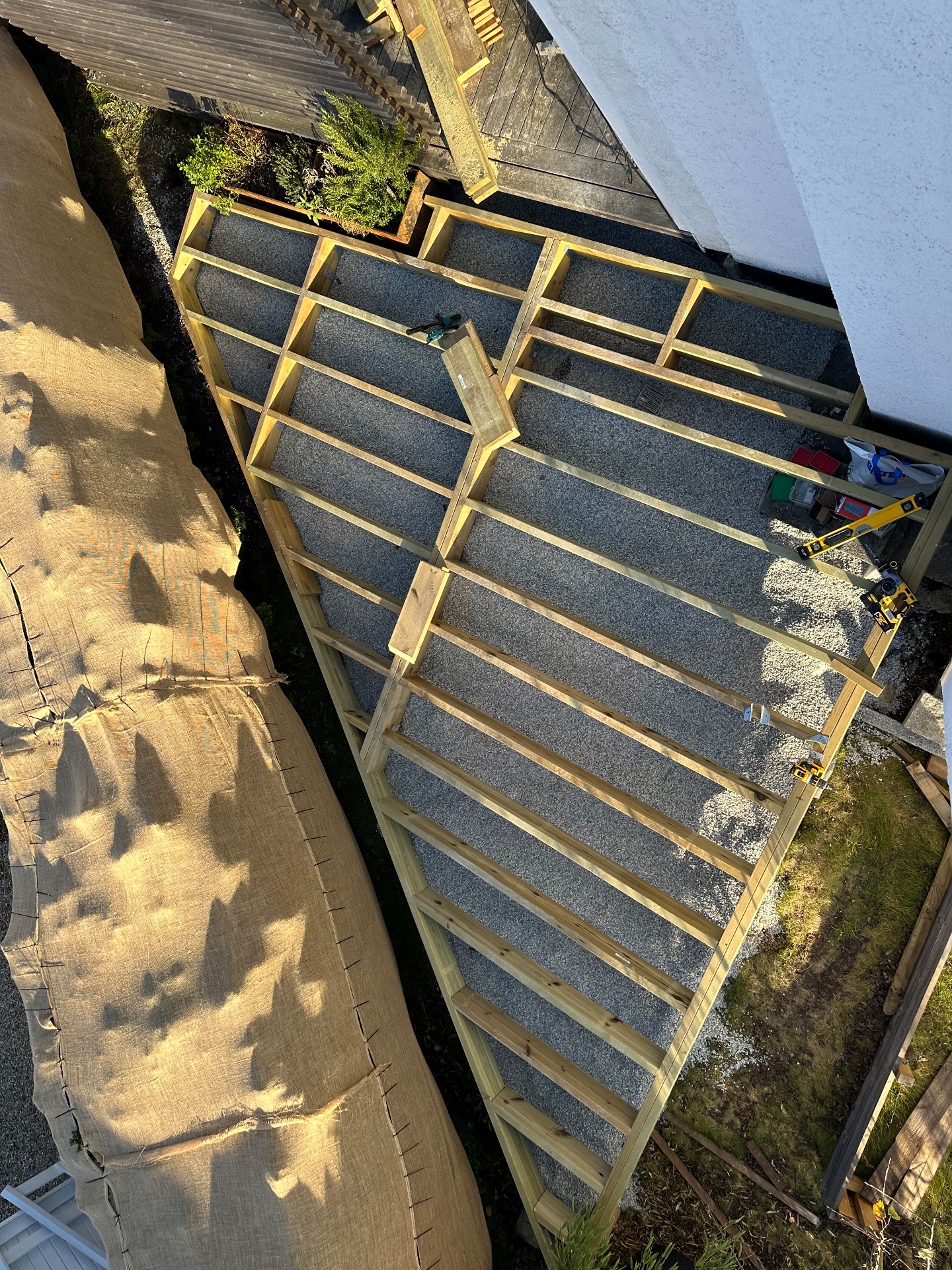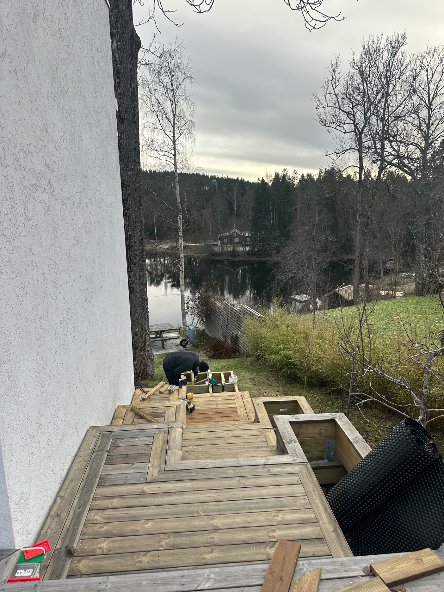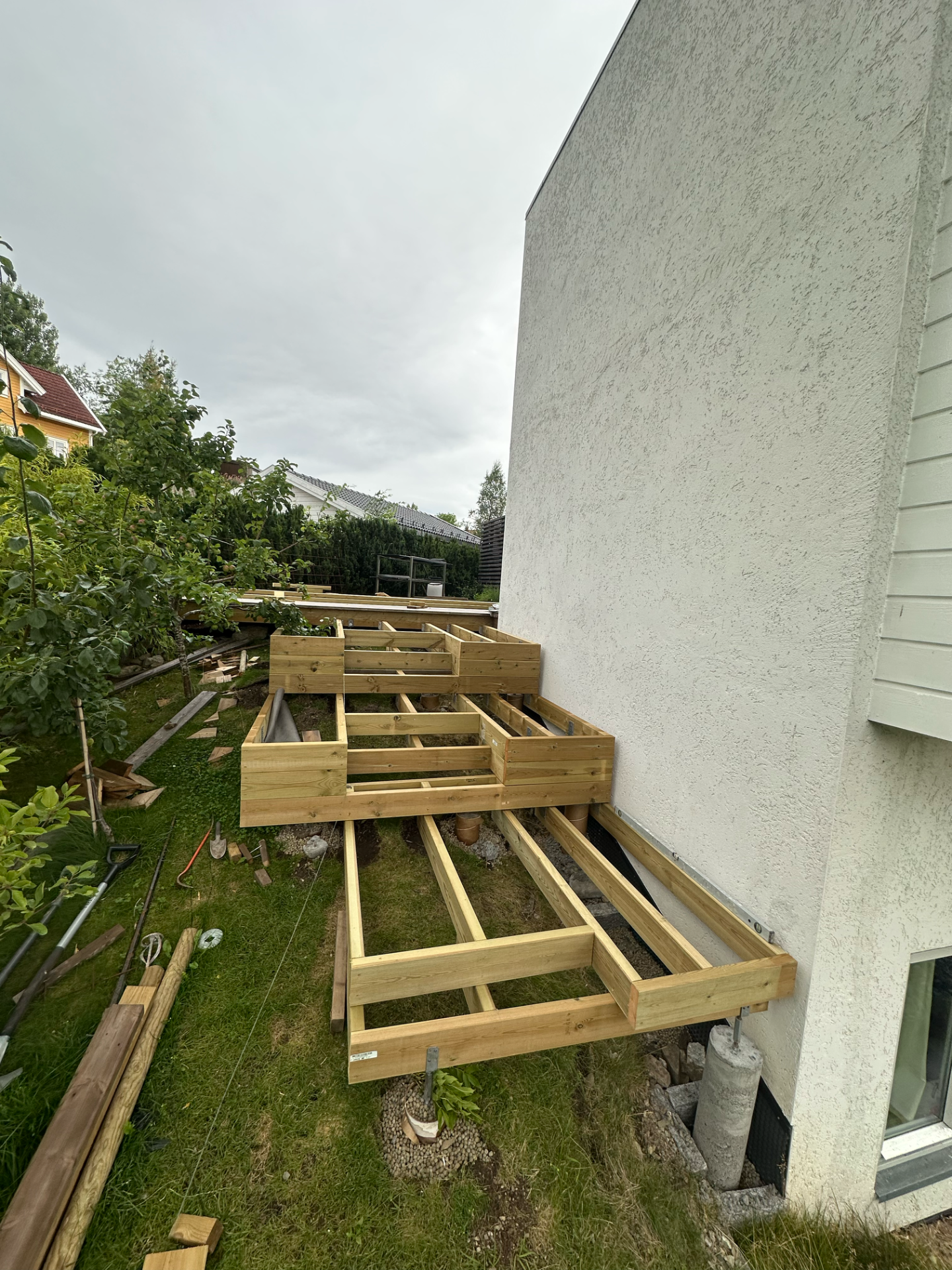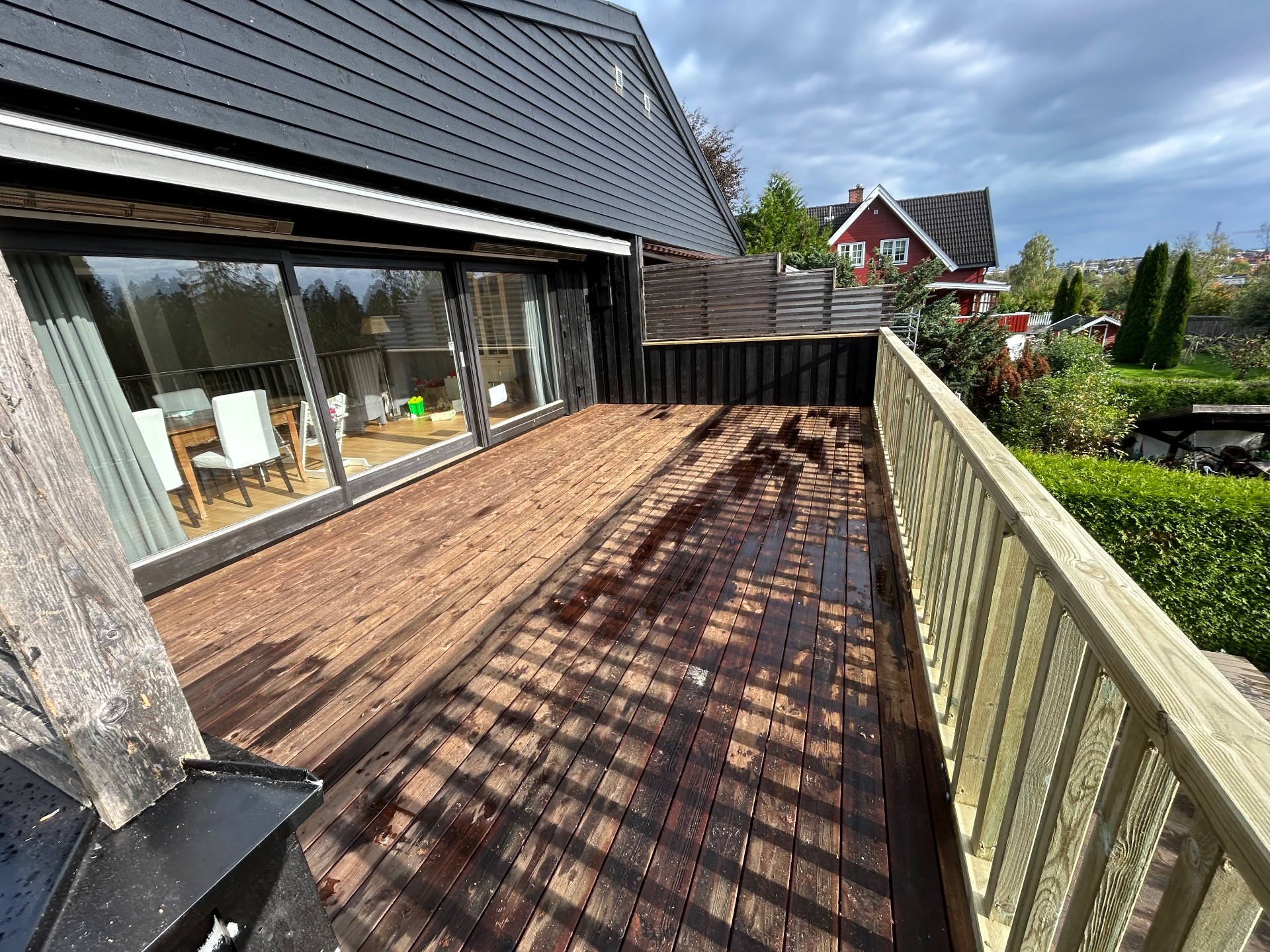 Kunden ønsket å få forlenget terrassen og etablert en praktisk trappeløsning som leder ned mot vannet langs husets kortside. Vi utformet og bygde en utvidet terrasse som harmonerer med eksisterende konstruksjon, samt en solid og sikker trapp som gir enkel tilgang til uteområdet og vannkanten.