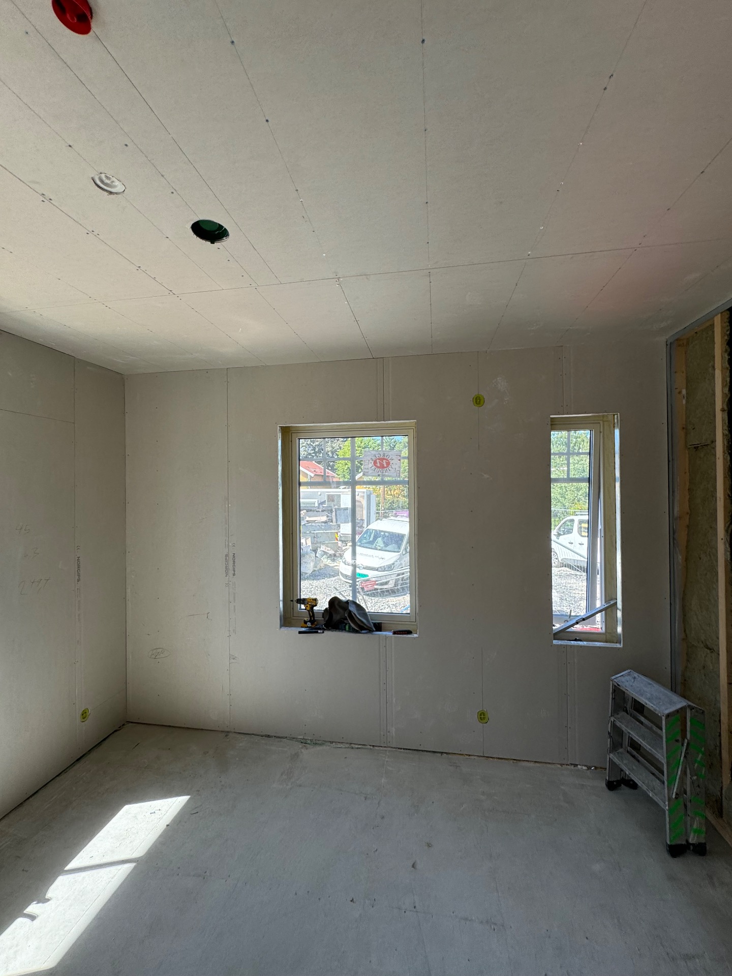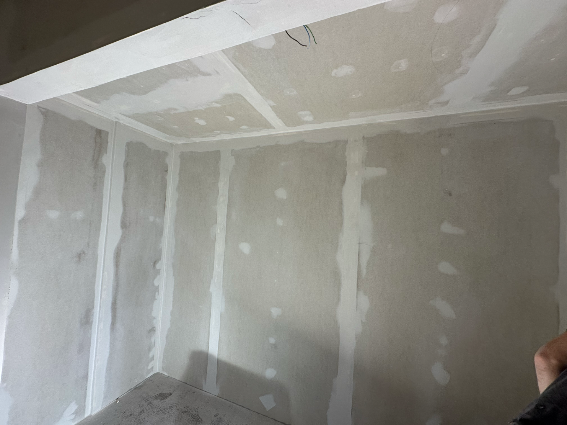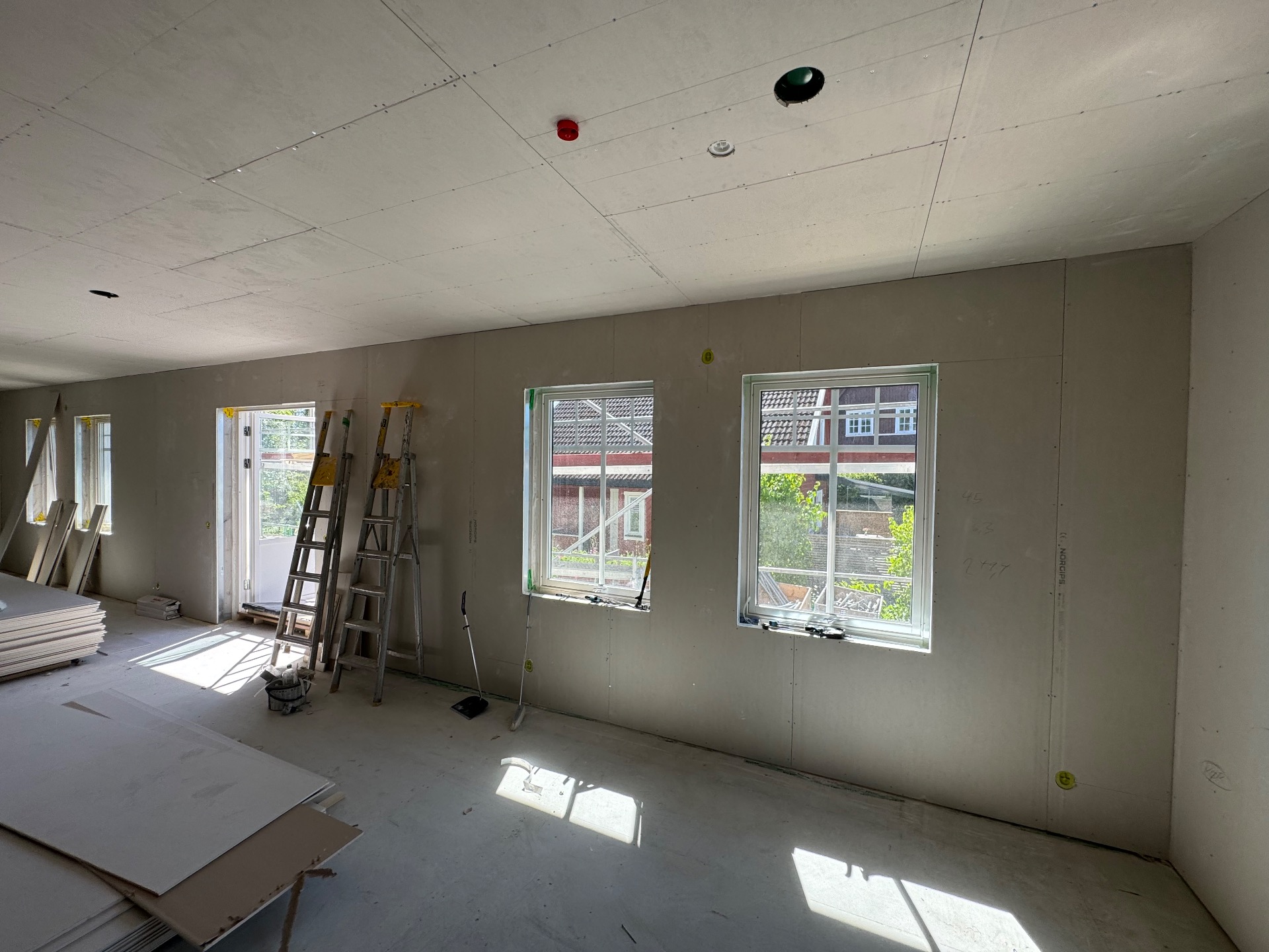 Her ønsket kunden at vi kun skulle sette opp stendere og gipsvegger. Vi leverte og monterte en solid stenderkonstruksjon og kledde den med gipsplater for et rent og presist grunnlag klart for videre overflatebehandling.