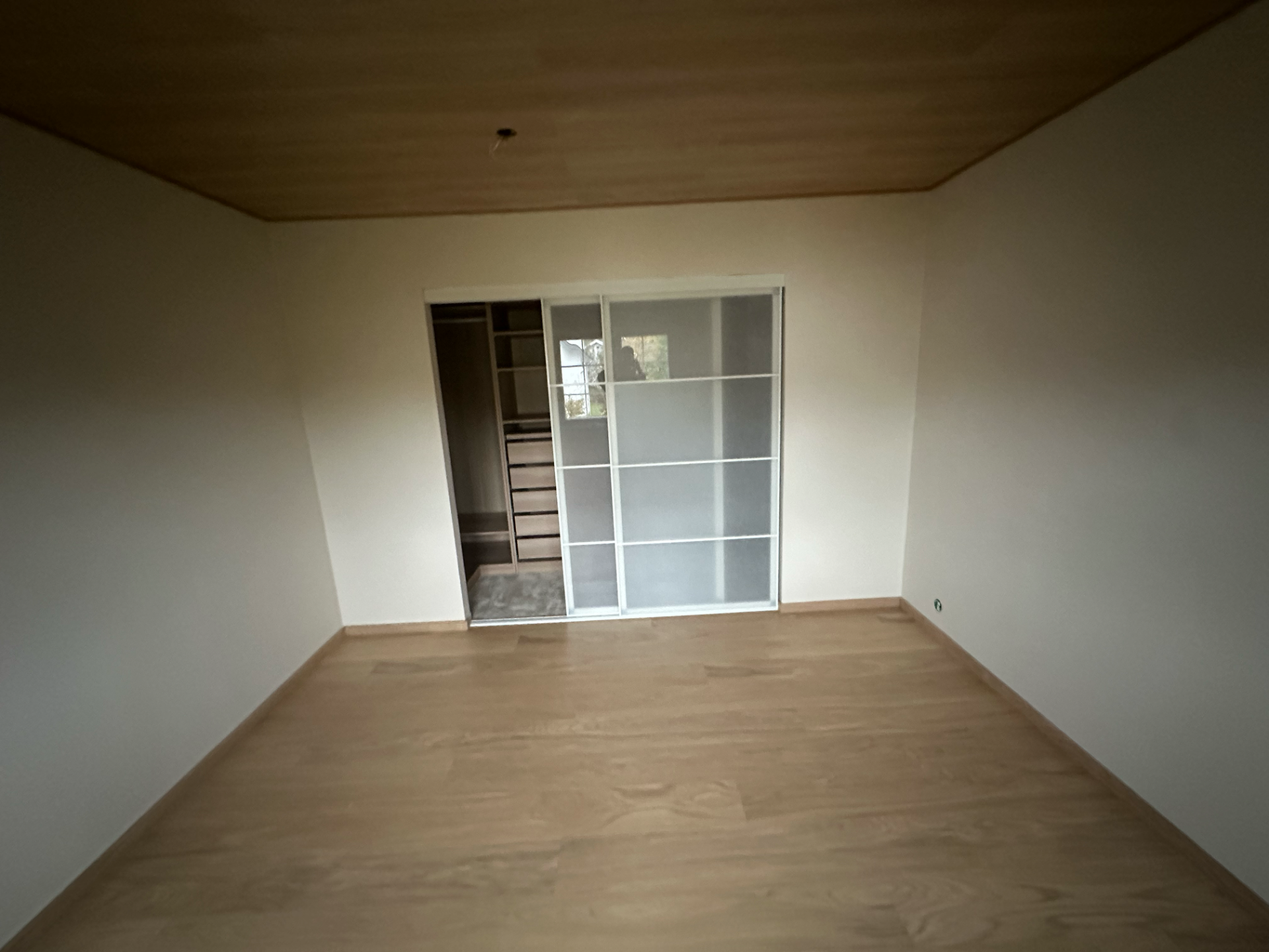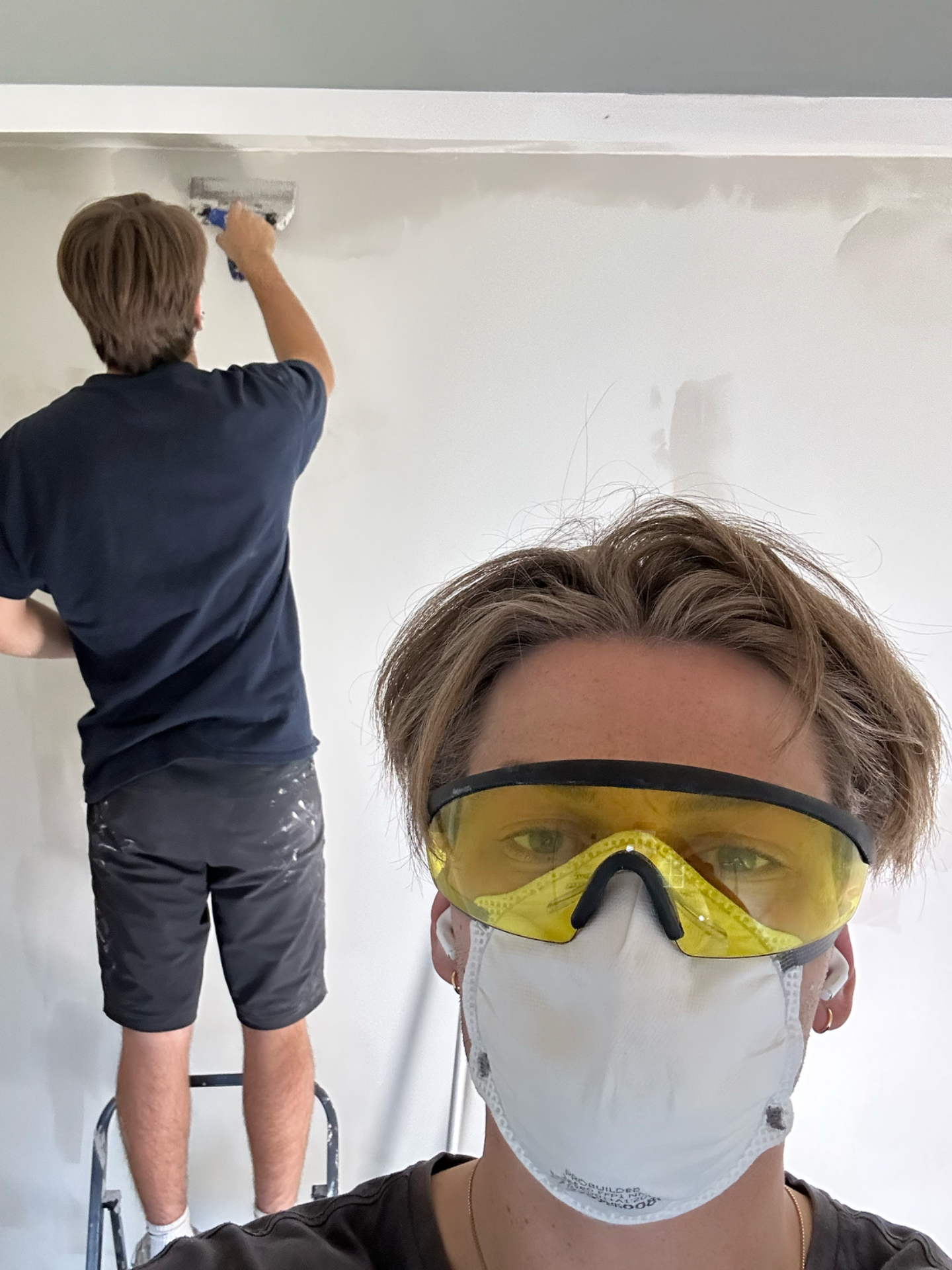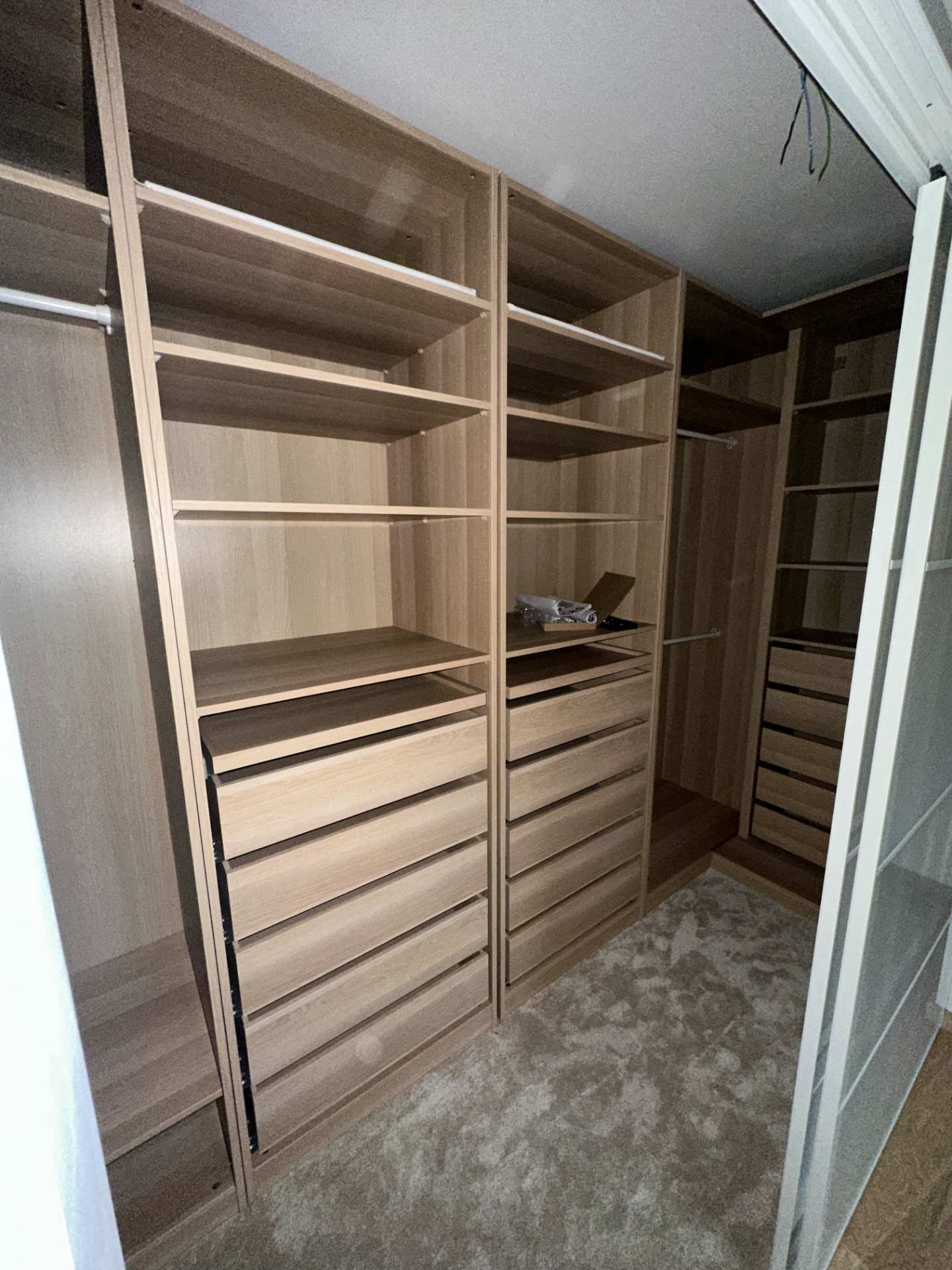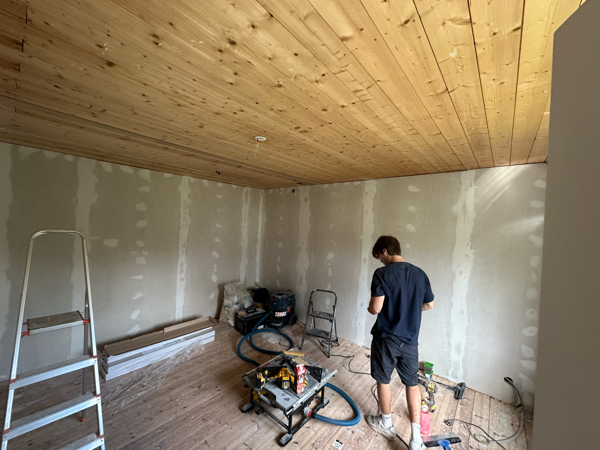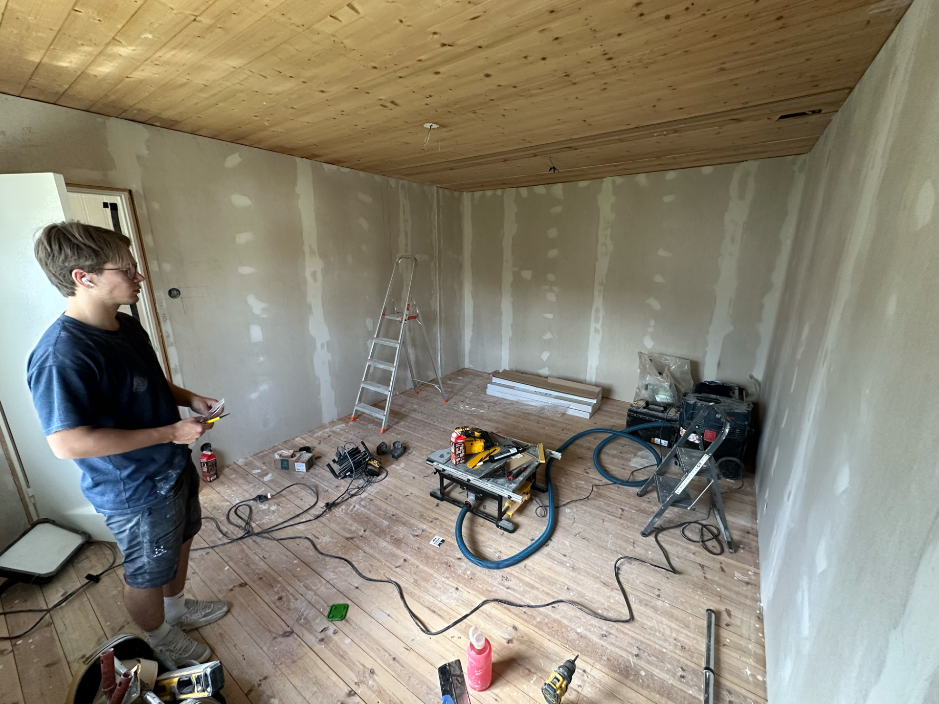 Dette soverommet fikk en total forvandling! Vi har rettet opp og lagt nytt gulv, sparklet og malt veggene, satt opp en lettvegg med skyvedører, lagt laminat i taket, montert en IKEA-garderobe, laget et stilrent listefritt tak og satt inn en helt ny dør.
